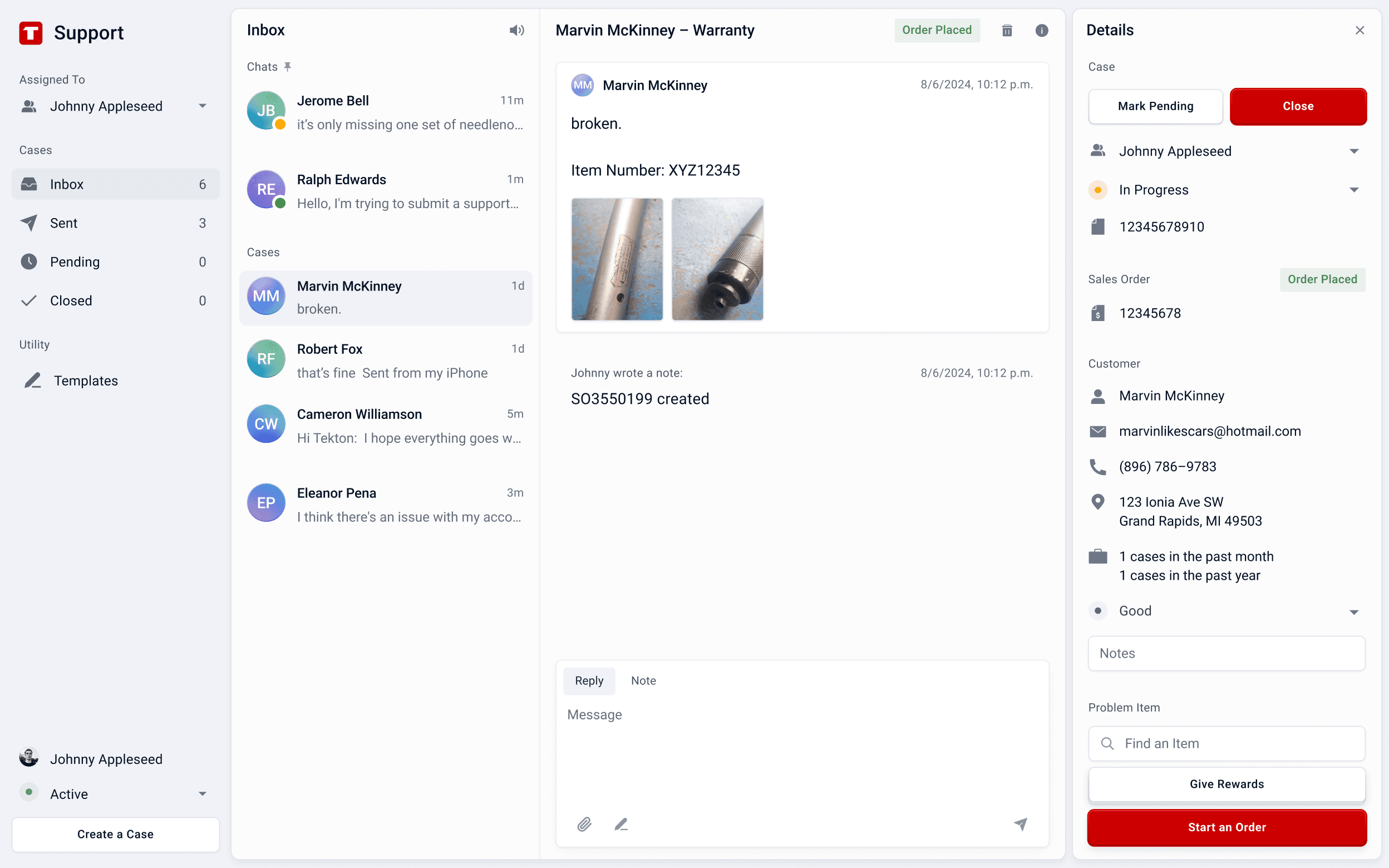 Tekton Support (TS) is an internal website that helps the Tekton Hand Tools customer support team respond to questions and send manage warranties.